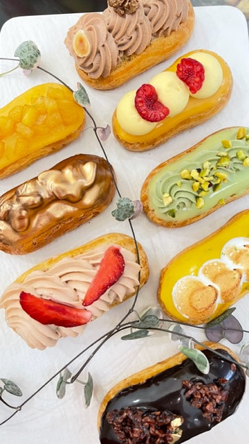 Entdecken Sie unsere halben Eclairs, eine raffinierte und praktische Version unseres charakteristischen Gebäcks. Sie sind perfekt für Ihre Veranstaltungen und in mehreren Geschmacksrichtungen erhältlich, um alle Wünsche zu erfüllen. Eine köstliche und elegante Note, die man ohne Mäßigung genießen kann!