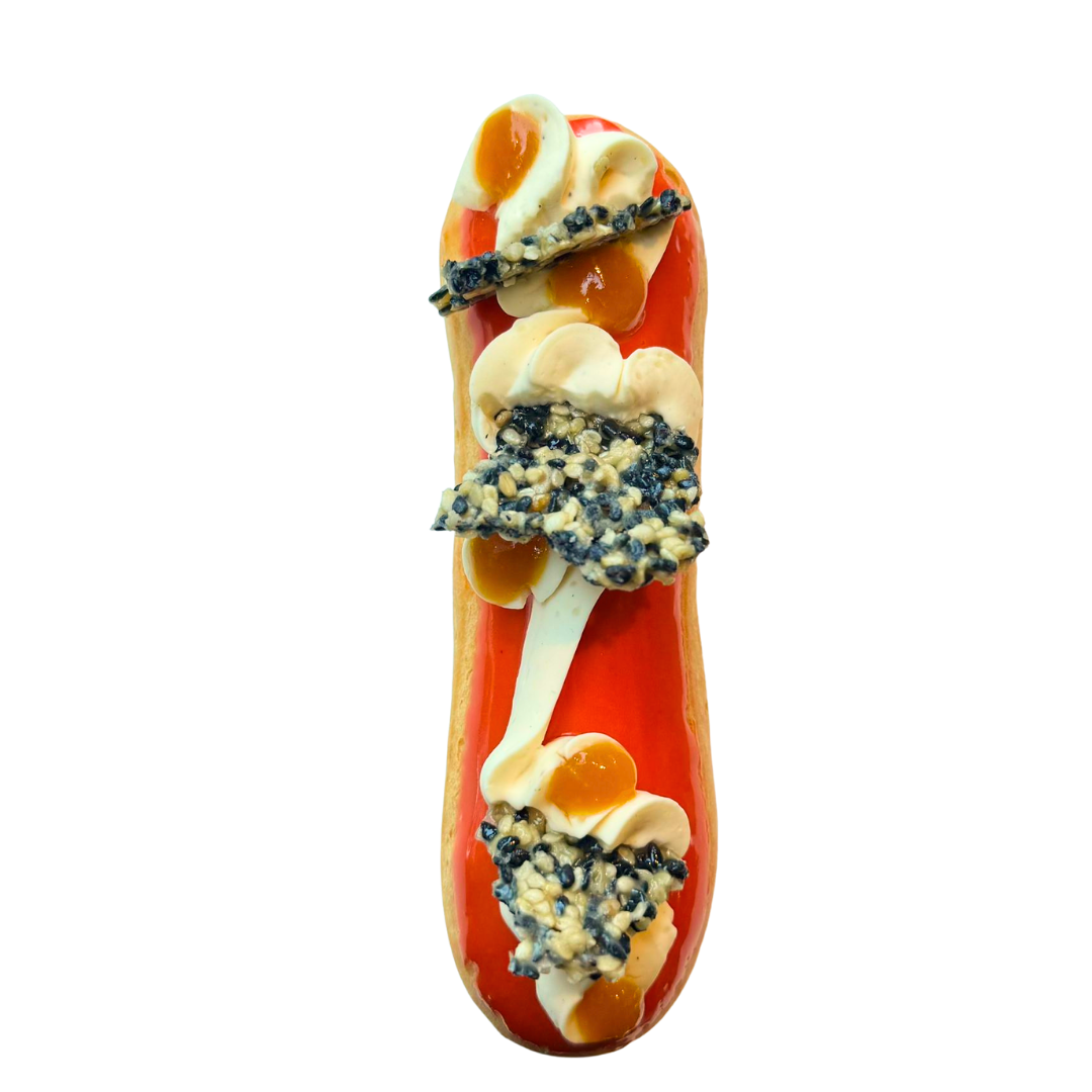 Un éclair vibrant et raffiné, où la douceur du chocolat blanc rencontre l’énergie des agrumes et la surprise des épices.